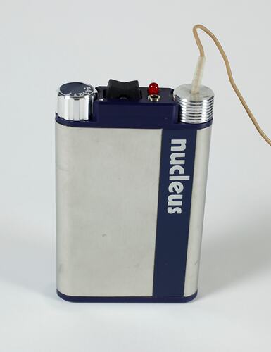 Rectangular dark blue and silver plastic unit with rounded sides.