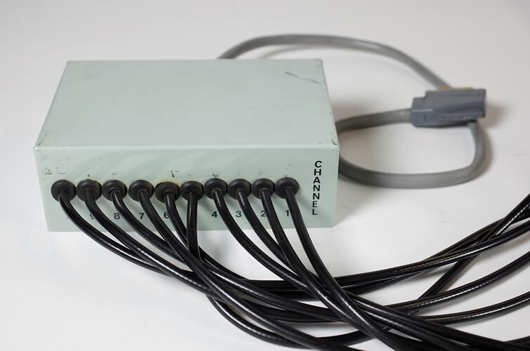 The receiver-stimulator required a junction box to be driven by the computer. The junction box to connect the computer and its speech stimuli to the receiver stimulator. The signals went via the transmitting coil and receiving coils shown in photos 006, 007.