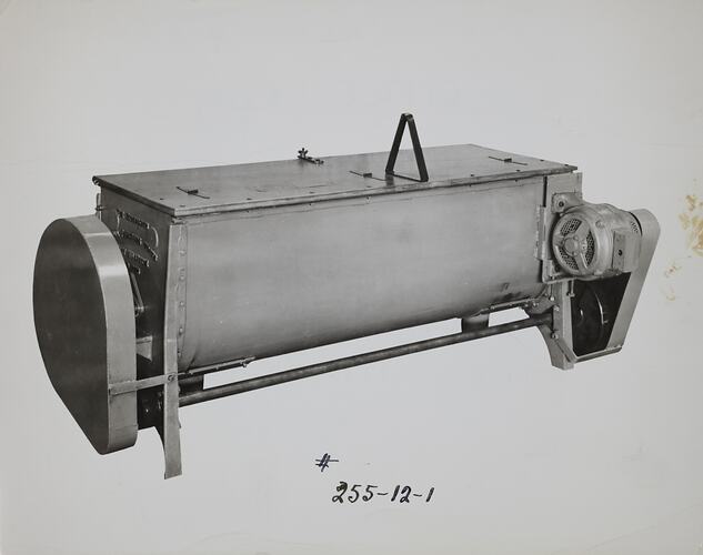 Printed in black ink on back of photograph: 'REVERSIBLE MIXING AGITATOR / two slide discharges, / cut down legs, / heavy shaft and Mixing spiral. / SUPPLIED TO OR. 4 4 7 7 9 --- dated 5/5/44.' Hand written in black ink on back of photograph: 'OFFICE COPY' Hand written in black ink on front of photograph: '# / 255-12-1'