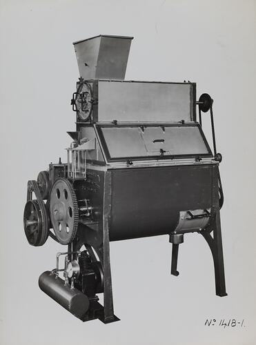Black and white promotional image of a machine. It is part of a collection of photographs and marked printer's copy used in the preparation of trade literature promoting products manufactured by the Schumacher Mill Furnishing Works Pty Ltd. The items were originally housed in a wooden filing drawer, with many filed by subject. This photograph was previously filed under 'With Elev'.