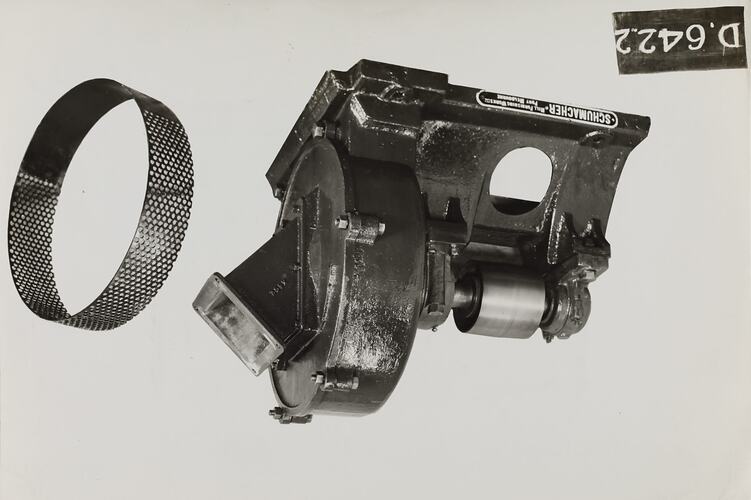 Printed in black ink on cream label adhered to the back of photograph: 'From Schumacher Mill Furnishing Works / PROPRIETARY LIMITED. / No. 2 - 18" SPECIAL SWING / HAMMER "HERCULES" GRINDING / MILL. / SUPPLIED TO EICHNER BROS. - W.A. / PORT MELBOURNE, / VICTORIA.' Printed in red ink on cream label adhered to the back of photograph: 'ORDER NO. 37400 - dated 15/6/38.' Printed in red ink on the back of photogtaph: 'PHOTO HILE NO. / SECTION NO.' Printed in black ink on back of photograph: 'Kerr / BROS. / COMMERCIAL / PHOTOGRAPHERS / 533 COLLINS ST. MELBOURNE' Handwritten in white on the front of photograph: 'D.642-2' Handwritten in black ink on the back of photograph: 'No. 44' Handwritten in grey pencil on the back of photograph: 'SECTION.NO. 10B'