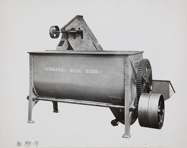 Black and white promotional image of mixing equipment. It is part of a collection of photographs and marked printer's copy used in the preparation of trade literature promoting products manufactured by the Schumacher Mill Furnishing Works Pty Ltd. The items were originally housed in a wooden filing drawer, with many filed by subject. This photograph was previously filed under 'With Elev'.
