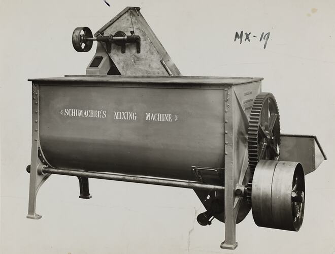 Black and white promotional image of mixing equipment. It is part of a collection of photographs and marked printer's copy used in the preparation of trade literature promoting products manufactured by the Schumacher Mill Furnishing Works Pty Ltd. The items were originally housed in a wooden filing drawer, with many filed by subject. This photograph was previously filed under 'With Elev'.
