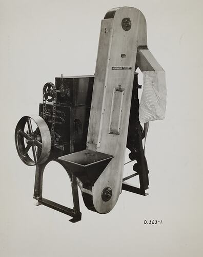 Hand written in black ink on front of photograph: 'D.363-1.' Printed in black ink on back of photograph: 'Kerr / BROS. / COMMERCIAL / PHOTOGRAPHERS / 533 COLLINS ST. MELBOURNE' Printed in black ink on back of photograph: 'PHOTO FILE NO / SECTION / NO. 10 MIXER AND SIFTER WITH CIRCULATING / ELEVATOR SUPPLIED TO OR NO. 3 8 0 0 5 / 19/12/38.' Printed in red ink on back of photograph: 'OFFICE COPY ONLY' Hand written in black ink on back of photograph: '55' Hand written in grey pencil on back of photograph: '15 / yes'