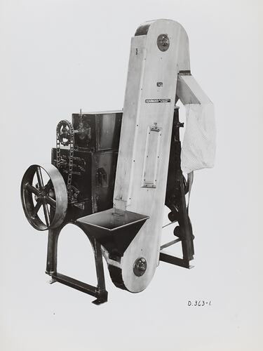 Black and white promotional image of a number 10 mixer and sifter. It is part of a collection of photographs and marked printer's copy used in the preparation of trade literature promoting products manufactured by the Schumacher Mill Furnishing Works Pty Ltd. The items were originally housed in a wooden filing drawer, with many filed by subject. This photograph was previously filed under 'With Elev'.