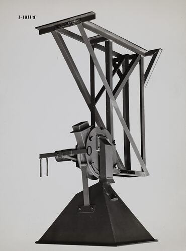 Black and white promotional image of a number 1-A 'Hercules' machine. It is part of a collection of photographs and marked printer's copy used in the preparation of trade literature promoting products manufactured by the Schumacher Mill Furnishing Works Pty Ltd. The items were originally housed in a wooden filing drawer, with many filed by subject. This photograph was previously filed under 'GRAVITY'.
