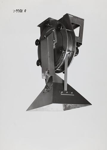Black and white promotional image of a grinder machine. It is part of a collection of photographs and marked printer's copy used in the preparation of trade literature promoting products manufactured by the Schumacher Mill Furnishing Works Pty Ltd. The items were originally housed in a wooden filing drawer, with many filed by subject. This photograph was previously filed under 'GRAVITY'.
