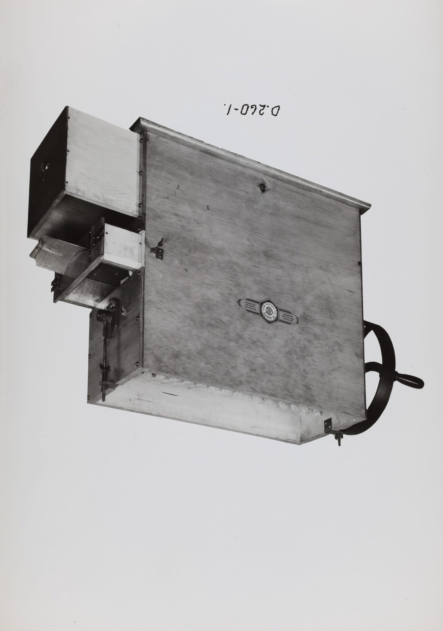 Handwritten in black on front of photograph: 'D.260-1' Printed in red ink on the back of photograph: 'MIXING EQUIPMENT.' Printed in black ink on back of photograph: 'SCHUMACHER MILL FURNISHING WORKS PTY. LTD. / GRAHAM ST. PORT MELBOURNE. / S. C. 7 VICTORIA. / TELEPHONE MX 2171'