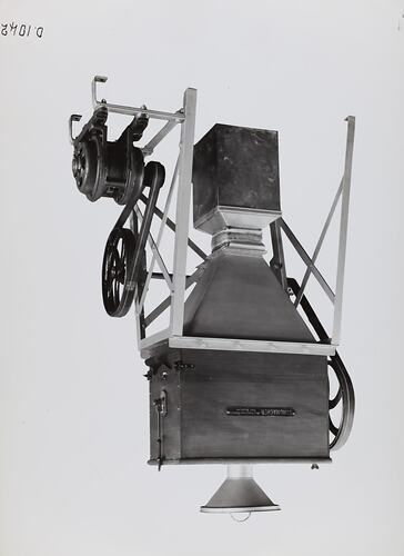 Black and white promotional image of mixer and sifter. It is part of a collection of photographs and marked printer's copy used in the preparation of trade literature promoting products manufactured by the Schumacher Mill Furnishing Works Pty Ltd. The items were originally housed in a wooden filing drawer, with many filed by subject. This photograph was previously filed under 'No 10 & No 11'.