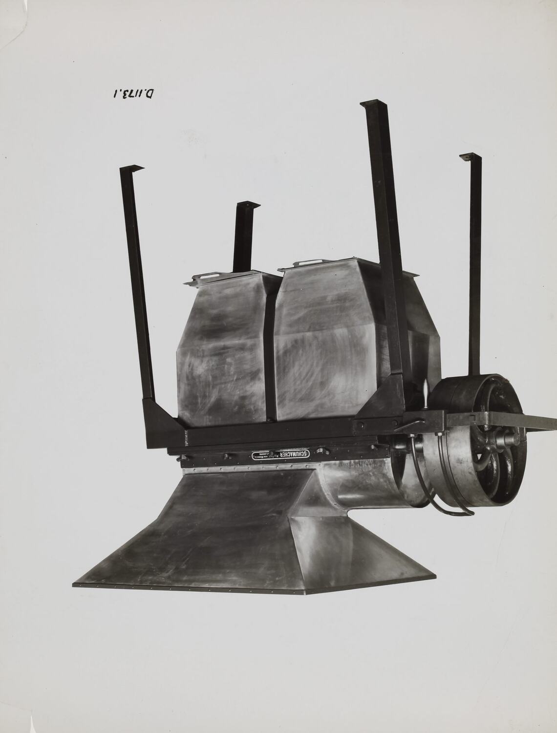 Printed in black ink on a cream label adhered to back of photograph: 'From / Schumacher Mill Furnishing Works / PROPRIETARY LIMITED. / ORDER NO. 4 0 5 4 7, 3/2/41 - / COVERING 3. SPECIAL GUN-COTTON / TEARING OR BREAKING MACHINES. / PORT MELBOURNE, / VICTORIA.' Handwritten in grey pencil on the back of photograph: 'Termed / "Sifter"' Printed in back ink on back of photograph: 'Kerr / BROS. / COMMERCIAL / PHOTOGRAPHERS / 533 COLLINS ST. MELBOURNE' Handwritten in black ink on the front of photograph: 'D.1173-1'