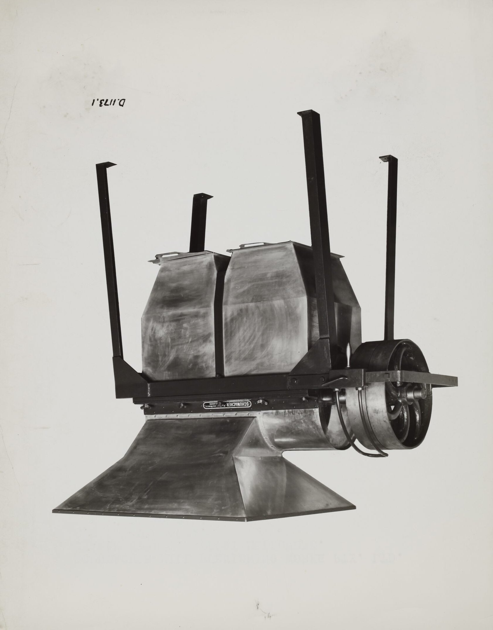Black and white promotional image of a sifter. It is part of a collection of photographs and marked printer's copy used in the preparation of trade literature promoting products manufactured by the Schumacher Mill Furnishing Works Pty Ltd. The items were originally housed in a wooden filing drawer, with many filed by subject. This photograph was previously filed under 'No 10 & No 11'.