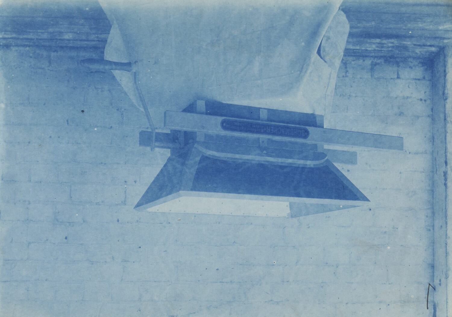 Cyanotype promotional image of brush sifter. It is part of a collection of photographs and marked printer's copy used in the preparation of trade literature promoting products manufactured by the Schumacher Mill Furnishing Works Pty Ltd. The items were originally housed in a wooden filing drawer, with many filed by subject. This photograph was previously filed under 'No 10 & No 11'.