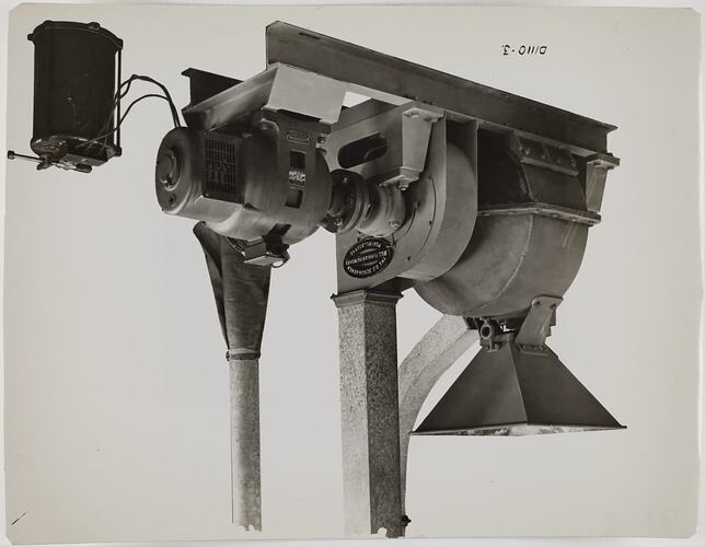 Black and white promotional image of a machine. It is part of a collection of photographs and marked printer's copy used in the preparation of trade literature promoting products manufactured by the Schumacher Mill Furnishing Works Pty Ltd. The items were originally housed in a wooden filing drawer, with many filed by subject. This photograph was previously filed under 'PULVERIZERS'.
