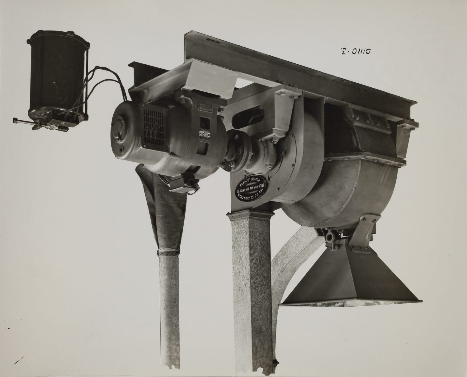 Printed in black ink on back of photograph: 'SCHUMACHER MILL FURNISHING WORKS PTY. LTD. / GRAHAM ST. PORT MELBOURNE. / S. C. 7 VICTORIA. / TELEPHONE MX 2171' Printed in purple ink on back of photograph: 'Kerr / BROS. / COMMERCIAL / PHOTOGRAPHERS / 533 COLLINS ST. MELBOURNE' Handwritten in black on the front of photograph: 'D1110-3'