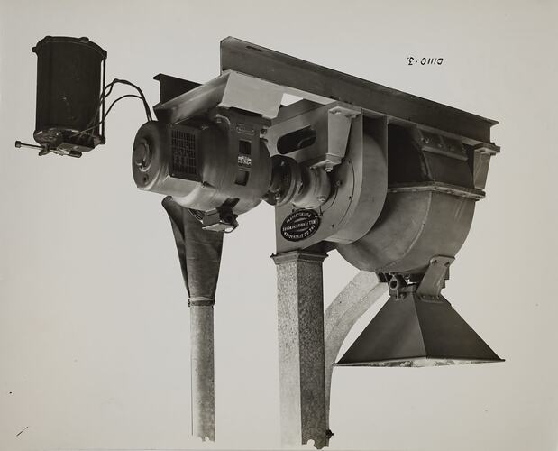 Black and white promotional image of a machine. It is part of a collection of photographs and marked printer's copy used in the preparation of trade literature promoting products manufactured by the Schumacher Mill Furnishing Works Pty Ltd. The items were originally housed in a wooden filing drawer, with many filed by subject. This photograph was previously filed under 'PULVERIZERS'.