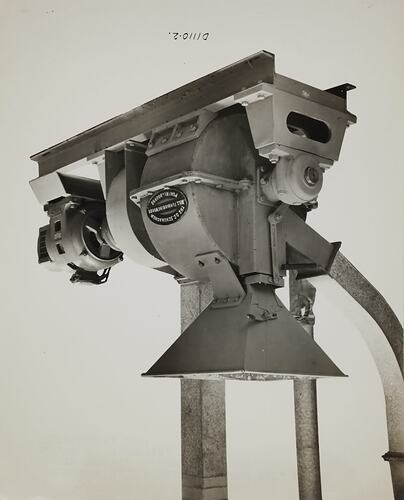 Printed in black ink on back of photograph: 'SCHUMACHER MILL FURNISHING WORKS PTY. LTD. / GRAHAM ST. PORT MELBOURNE. / S. C. 7 VICTORIA. / TELEPHONE MX 2171 / NO. 13 SPECIAL GRINDING MACHINE WITH FAN / PICK-UP CONTROL ETC. / SUPPLIED TO ORDER 39013.' Printed in purple ink on back of photograph: 'Kerr / BROS. / COMMERCIAL / PHOTOGRAPHERS / 533 COLLINS ST. MELBOURNE' Handwritten in black ink on the front of photograph: 'D 1110-2'
