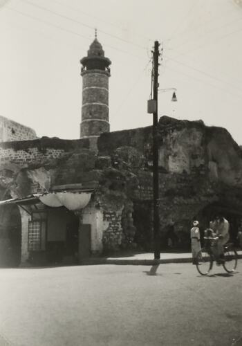 Photograph from a leather album with a tin impression of David's Tower on front cover. The album belonged to Sister Isabel Plante, a nurse at the 7th Australian General Hospital in Palestine. It was given to her by 'the boys of the no 6th Ward', Christmas 1941. The album contains 99 images, including pictures of Sister Plante and her nursing colleagues, images of patients, and tourist images of Gaza, Cairo, Jerusalem and other towns in the region. There is also a photo postcard of a nurse at Gaalbek, and a loose photo of nurses and patients in a ward of the hospital dated Christmas Day, 1943.