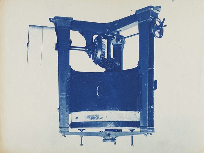 Cyanotype promotional image of a horizontal stone mill. It is part of a collection of photographs and marked printer's copy used in the preparation of trade literature promoting products manufactured by the Schumacher Mill Furnishing Works Pty Ltd. The items were originally housed in a wooden filing drawer, with many filed by subject. This photograph was previously filed under 'ROLLER MILLS'.