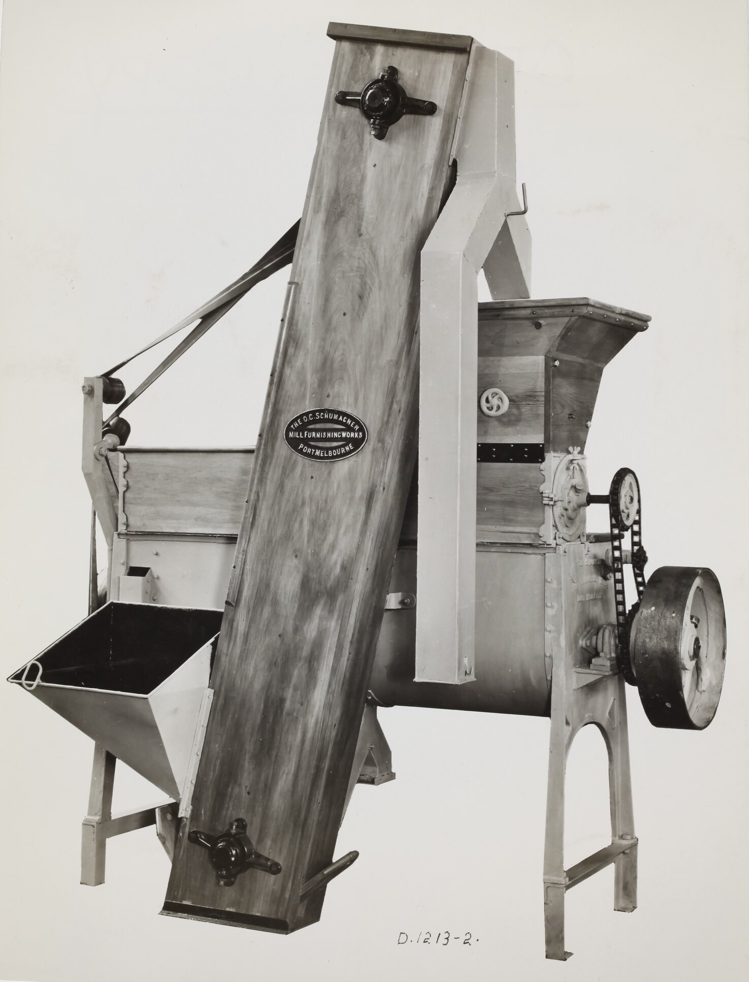 Hand written in black ink on front of photograph: 'D.1213-2.' Printed in purple ink on back of photograph: 'Kerr / BROS. / COMMERCIAL / PHOTOGRAPHERS / 533 COLLINS ST. MELBOURNE' Hand written in red pencil on back of photograph: 'OFFICE COPY' Printed in black ink on cream label attached to back of photograph: '1. only special No.13 MIXING & / SIFTING MACHINE, complete with / CIRCULATING ELEVATOR, DELIVERY SPOUTS, / HOPPER BET. ELEVATOR DISCHARGE & / SIFTER TOP, 2 SLIDE DISCHARGES. / Supplied under Or.No. 41227 / dated 15/8/41.'
