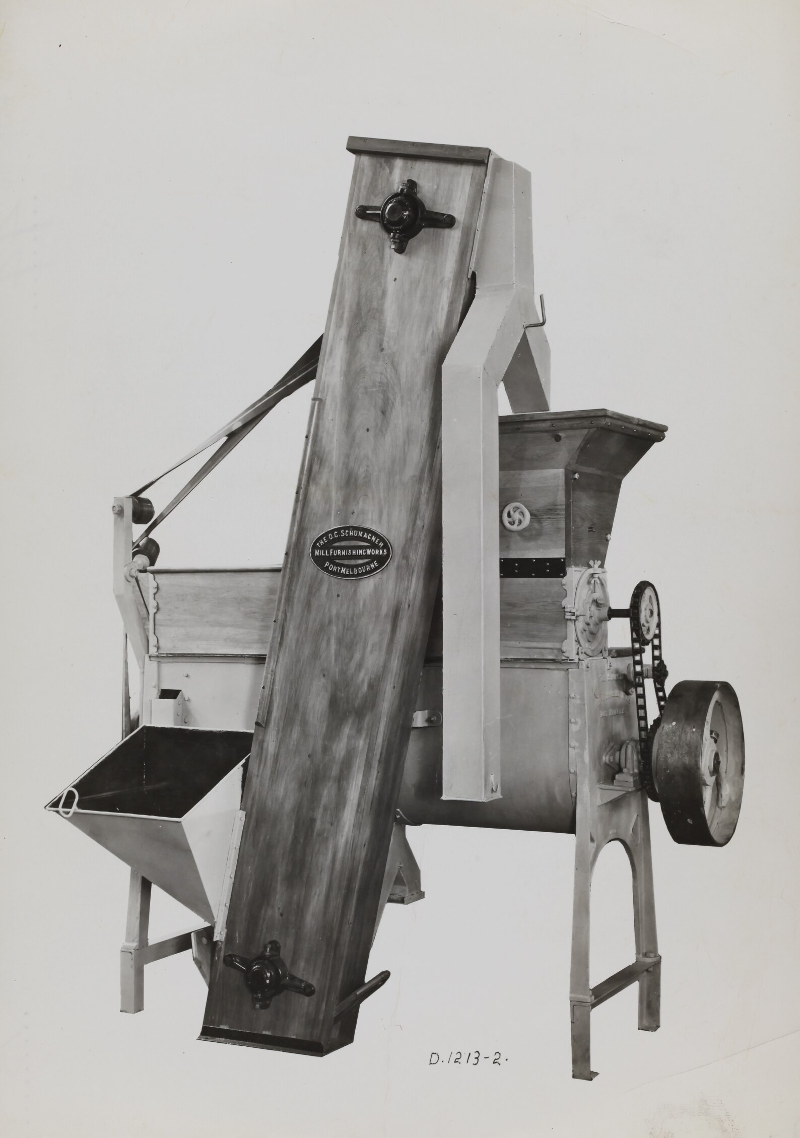 Black and white promotional image of a special number 13 mixing and sifting machine. It is part of a collection of photographs and marked printer's copy used in the preparation of trade literature promoting products manufactured by the Schumacher Mill Furnishing Works Pty Ltd. The items were originally housed in a wooden filing drawer, with many filed by subject. This photograph was previously filed under 'With Elev'.