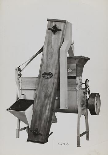 Hand written in black ink on front of photograph: 'D.1213-2.' Printed in red ink on back of photograph: 'OFFICE COPY ONLY' Hand written in black ink on back of photograph: '44' Hand written in grey pencil on back of photograph: '15 / No' Printed in black ink on back of photograph: 'PHOTO FILE NO / SECTION / SPECIAL NO. 13 MIXING AND SIFTING MACHINE / WITH CIRCULATING ELEVATOR, DELIVERY SPOUTS, / HOPPER BETWEEN ELEVATOR DISCHARGE AND SIFTER TOP, TWO SLIDE DISCHARGES / SUPPLIED TO OR. NO. 4 1 2 2 7 dated 15/8/41'
