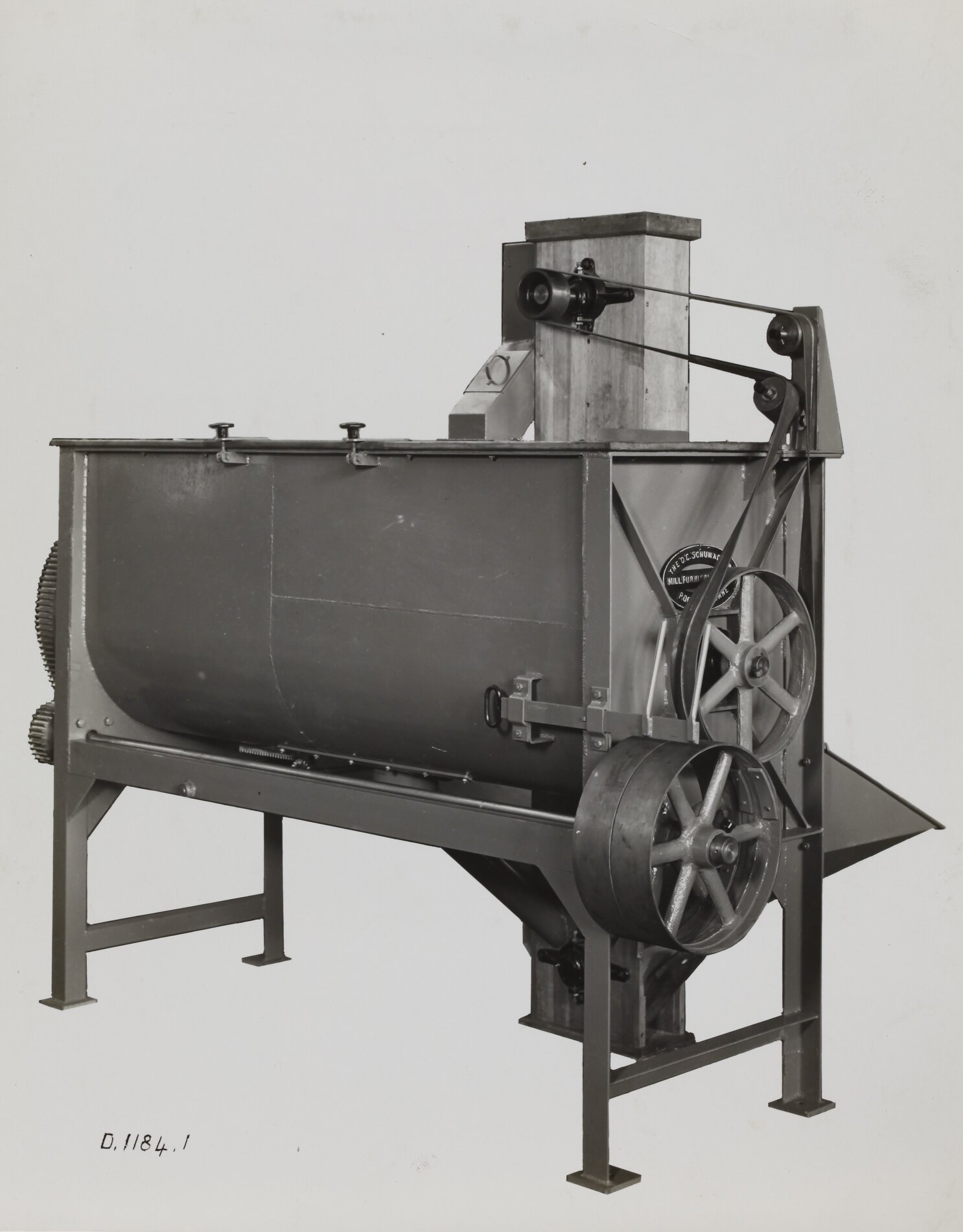 Hand written in black ink on front of photograph: 'D.1184-1' Printed in purple ink on back of photograph: 'Kerr / BROS. / COMMERCIAL / PHOTOGRAPHERS / 533 COLLINS ST. MELBOURNE' Hand written in red pencil on back of photograph: 'OFFICE COPY' Printed in black ink on a cream label attached to back of photograph: 'D.1184.1 Mixing Machine with circulating / feeding and discharge Elevator.' Printed in black ink on a cream label attached to back of photograph: ''From / Schumacher Mill Furnishing Works / PROPRIETARY LIMITED. / 1. No. 17 ALL STEEL FABRICATED / MIXER, 7'0" x 2'6" THROUGH. / Supplied under O.N. 40795 - 9/4/41. / PORT MELBOURNE, / VICTORIA.'