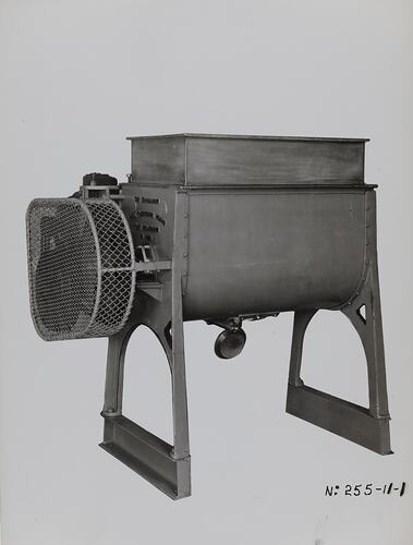 Black and white promotional image of a mixing machine. It is part of a collection of photographs and marked printer's copy used in the preparation of trade literature promoting products manufactured by the Schumacher Mill Furnishing Works Pty Ltd. The items were originally housed in a wooden filing drawer, with many filed by subject. This photograph was previously filed under 'With Elev'.