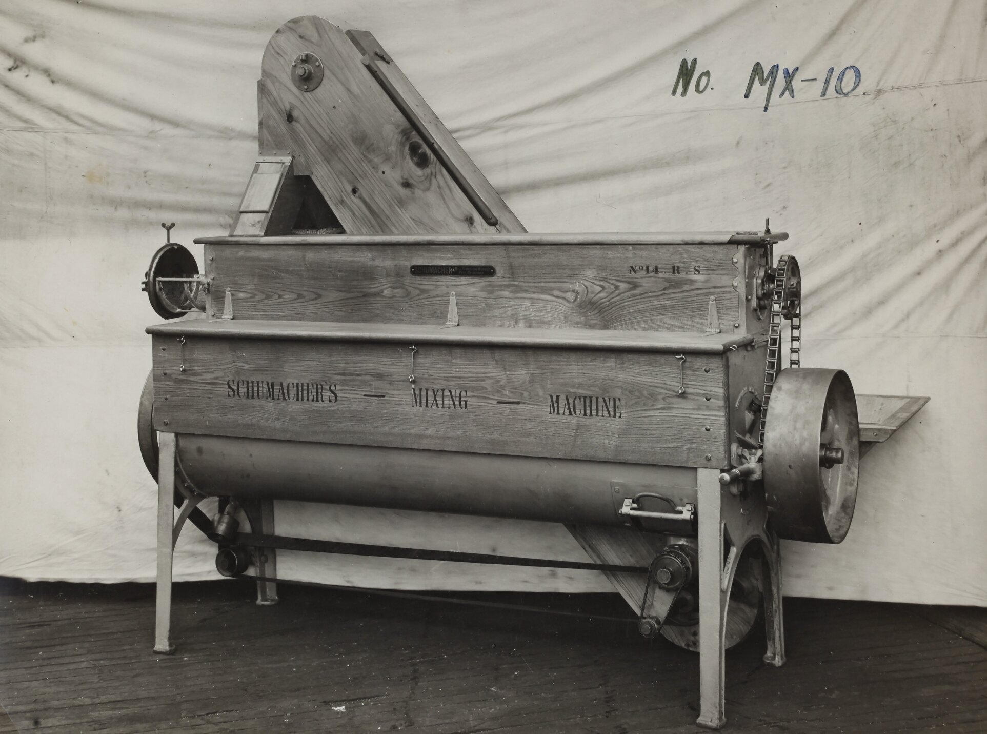Black and white promotional image of a mixing machine. It is part of a collection of photographs and marked printer's copy used in the preparation of trade literature promoting products manufactured by the Schumacher Mill Furnishing Works Pty Ltd. The items were originally housed in a wooden filing drawer, with many filed by subject. This photograph was previously filed under 'With Elev'.