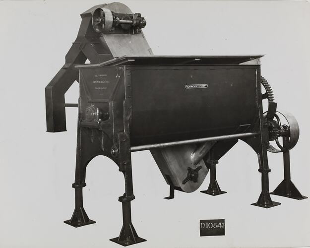 Printed in white text on front of photograph: 'D10842' Printed in purple ink on back of photograph: 'Kerr / BROS. / COMMERCIAL / PHOTOGRAPHERS / 533 COLLINS ST. MELBOURNE' Printed in black ink on back of photograph: 'PHOTO FILE NO / SECTION' Hand written in red pencil on back of photograph: 'OFFICE COPY' Hand written in grey pencil on back of photograph: '15 / No' Hand written in black ink on back of photograph: '51' Printed in black ink on a cream label attached to back of photograph: 'From / Schumacher Mill Furnishing Works / PROPRIETARY LIMITED. / GEAR-DRIVEN CIRCULATING ELEVATOR / AND MIXING PLANT. / SUPPLIED TO: / CLARK KING & CO. PTY. LTD. MELB. / O.N. 38372 - 13/4/39. / PORT MELBOURNE, / VICTORIA.'