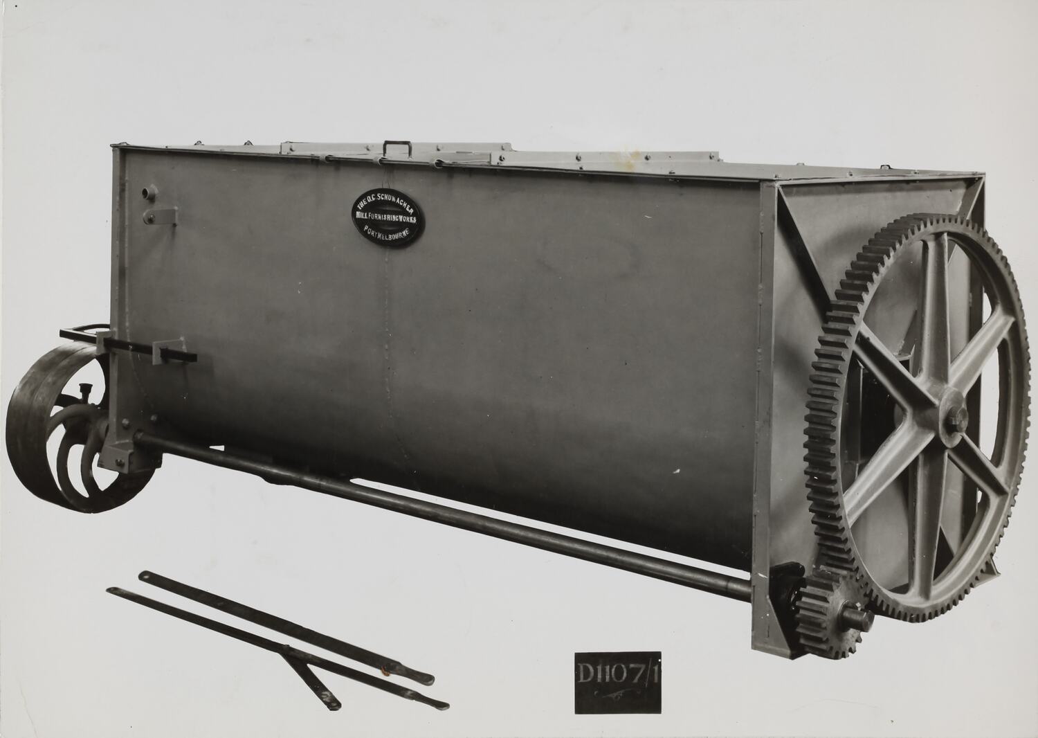 Printed in grey text on front of photograph: 'D1107/1' Printed in purple ink on back of photograph: 'Kerr / BROS. / COMMERCIAL / PHOTO' Hand written in red pencil on back of photograph: 'OFFICE COPY' Printed in black ink on a cream label attached to back of photograph: 'D.1107.1 Batch type Cooler, with / water-jacketed trough, similarly / constructed inside to a Mixing Machine.' Printed in black ink on a cream label attached to back of photograph: 'From / Schumacher Mill Furnishing Works / PROPRIETARY LIMITED. / PORT MELBOURNE, / VICTORIA.' Hand written in grey pencil on a cream label attached to back of photograph: '38958'