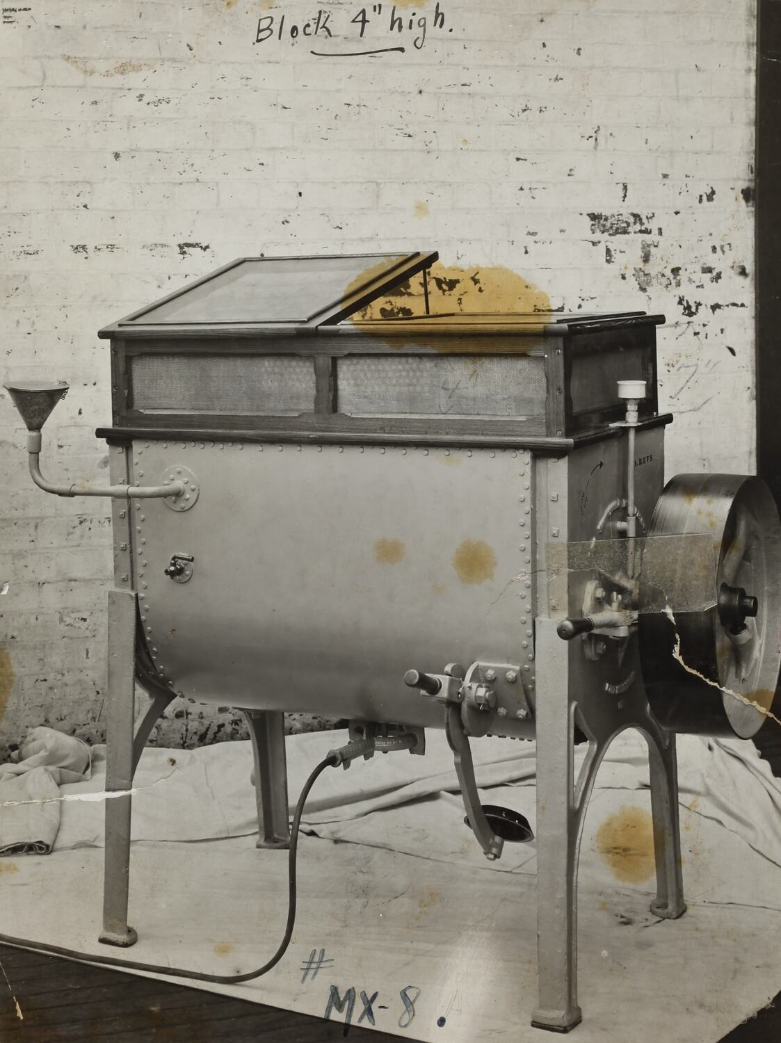 Hand written in black ink on front of photograph: 'Block 4" high. / # / MX-8' Hand written in black ink on back of photograph: '5 / 14[strikethrough]' Hand written in grey pencil on back of photograph: '15 / 28 5/8 / x / 20 / No' Hand written in red pencil on back of photograph: 'OFFICE / COPY' Printed in black ink on back of photograph: 'PHOTO FILE NO. / SECTION'