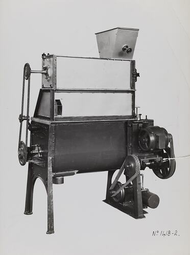 Black and white promotional image of a machine. It is part of a collection of photographs and marked printer's copy used in the preparation of trade literature promoting products manufactured by the Schumacher Mill Furnishing Works Pty Ltd. The items were originally housed in a wooden filing drawer, with many filed by subject. This photograph was previously filed under 'With Spray'.