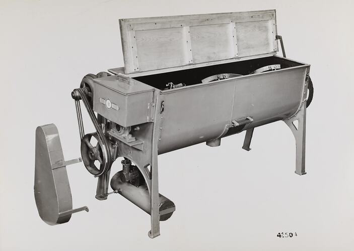 Hand written in black ink on front of photograph: '42504' Printed in black ink on back of photograph: 'Kerr / BROS. / COMMERCIAL / PHOTOGRAPHERS / 533 COLLINS ST. MELBOURNE' Printed in black ink on back of photograph: 'PHOTO FILE NO / SECTION / NO. 13 SIZE MIXING MACHINE WITH LIQUID SPRAY / ATTACHMENT AND FULL SIZE HINGED LID, and / 2-HP DRIVE SELF-CONTAINED / SUPPLIED TO OR NO. 42504 / DATED 26/6/42' Printed in red ink on back of photograph: 'OFFICE COPY ONLY' Hand written in black ink on back of photograph: '76[strikethrough] 20' Hand written in grey pencil on back of photograph: '15 / yes'