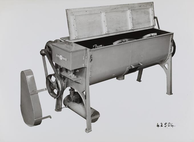 Black and white promotional image of a number 13 size mixing machine. It is part of a collection of photographs and marked printer's copy used in the preparation of trade literature promoting products manufactured by the Schumacher Mill Furnishing Works Pty Ltd. The items were originally housed in a wooden filing drawer, with many filed by subject. This photograph was previously filed under 'With Spray'.