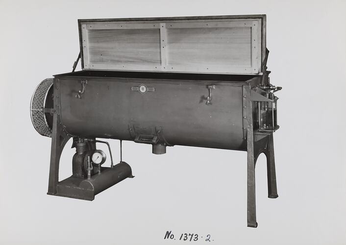 Black and white promotional image of a machine. It is part of a collection of photographs and marked printer's copy used in the preparation of trade literature promoting products manufactured by the Schumacher Mill Furnishing Works Pty Ltd. The items were originally housed in a wooden filing drawer, with many filed by subject. This photograph was previously filed under 'With Spray'.