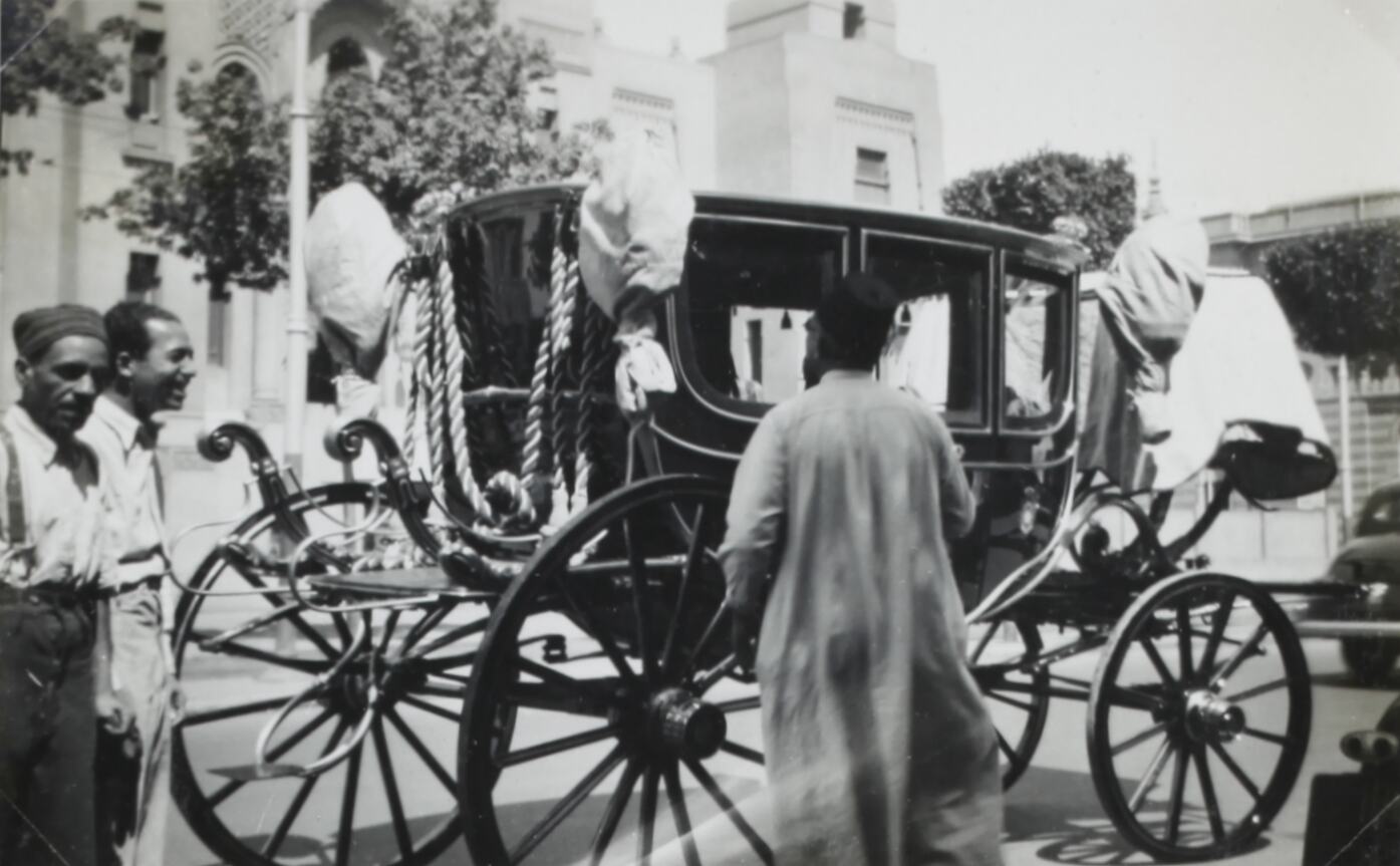 Three men standing around King Farouk's carriage. Buildings are pictured in the background.