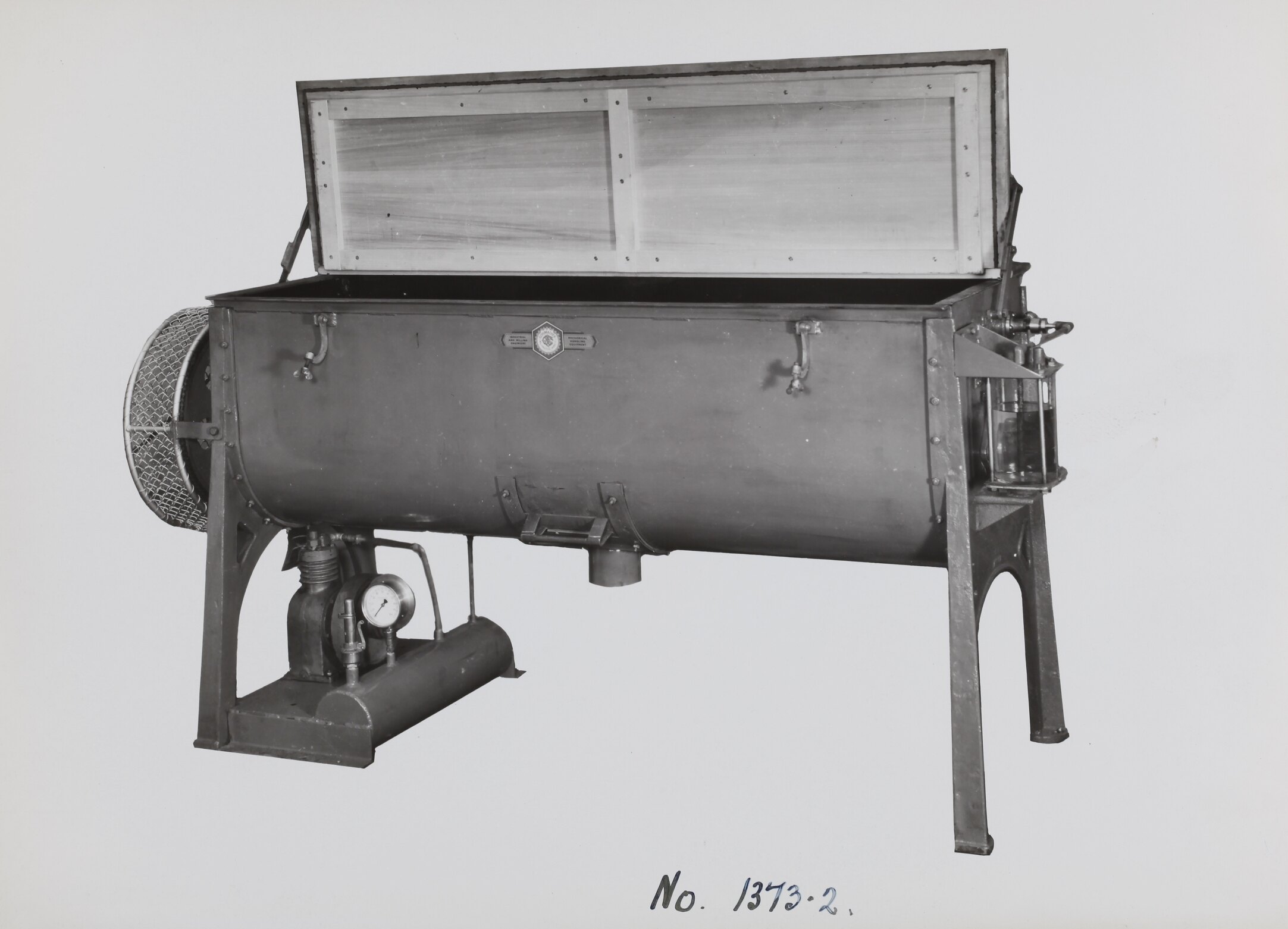 Black and white promotional image of a machine. It is part of a collection of photographs and marked printer's copy used in the preparation of trade literature promoting products manufactured by the Schumacher Mill Furnishing Works Pty Ltd. The items were originally housed in a wooden filing drawer, with many filed by subject. This photograph was previously filed under 'With Spray'.