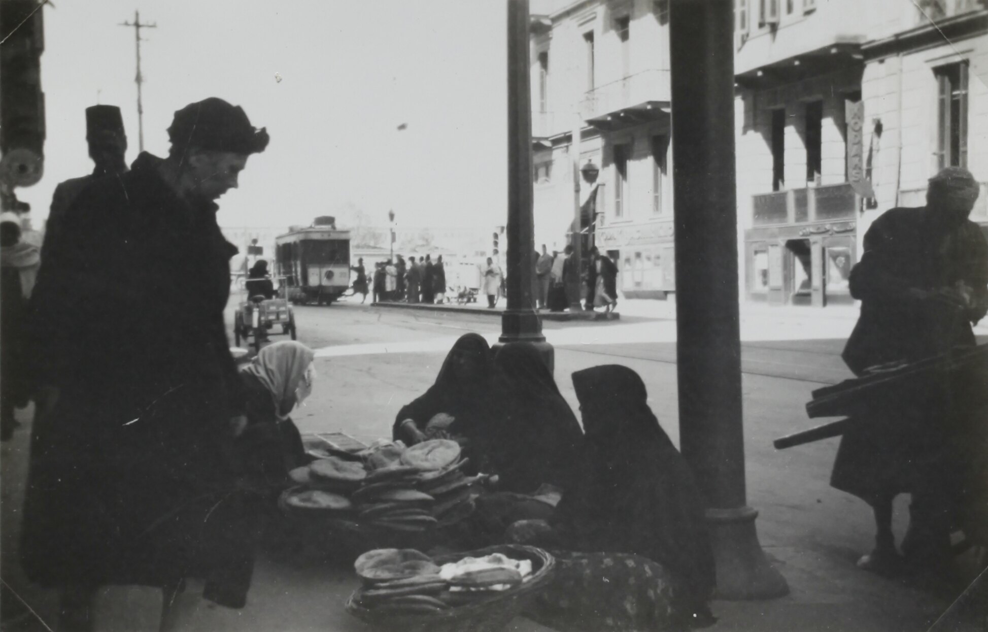 Streetscape showing women selling bread in the foreground. A tram and buildings are shown in the background.