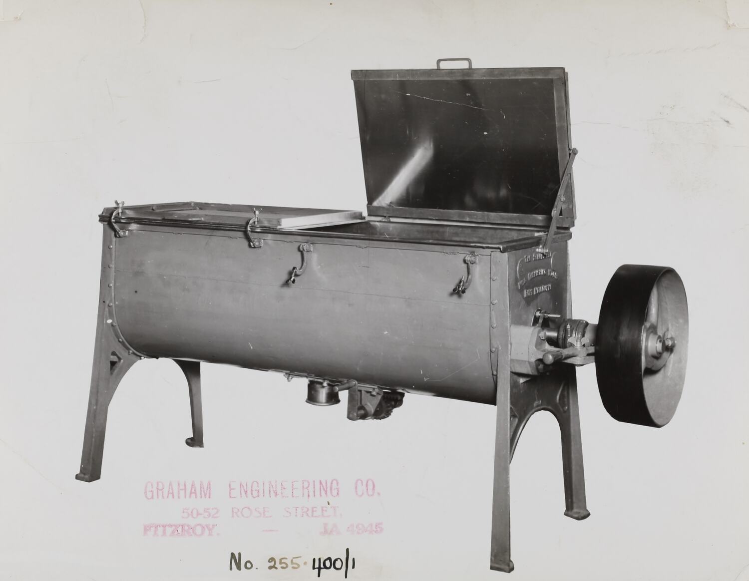 Hand written in black ink on front of photograph: 'No. 255-400/1' Printed in red ink on front of photograph: 'GRAHAM ENGINEERING CO. / 50-52 ROSE STREET, / FITZROY. - JA 4945' Printed in black ink on back of photograph: 'Kerr / BROS. / COMMERCIAL / PHOTOGRAPHERS / 533 COLLINS ST. MELBOURNE' Printed in red ink on back of photograph: 'GRAHAM ENGINEERING CO. / GRAHAM ENGINEERING CO. / GRAHAM ENGINEERING CO. / 50-52 ROSE STREET, / FITZROY. - JA 4945' Printed in black ink on back of photograph: 'NO. 13 STAINLESS STEEL LINED MIXING MACHINE - / CHAMBER 20" 0 X 65" LONG, CENTRE DELIVERY, / HALF LIDS HINGED FULL WIDTH. / Or. 46672'