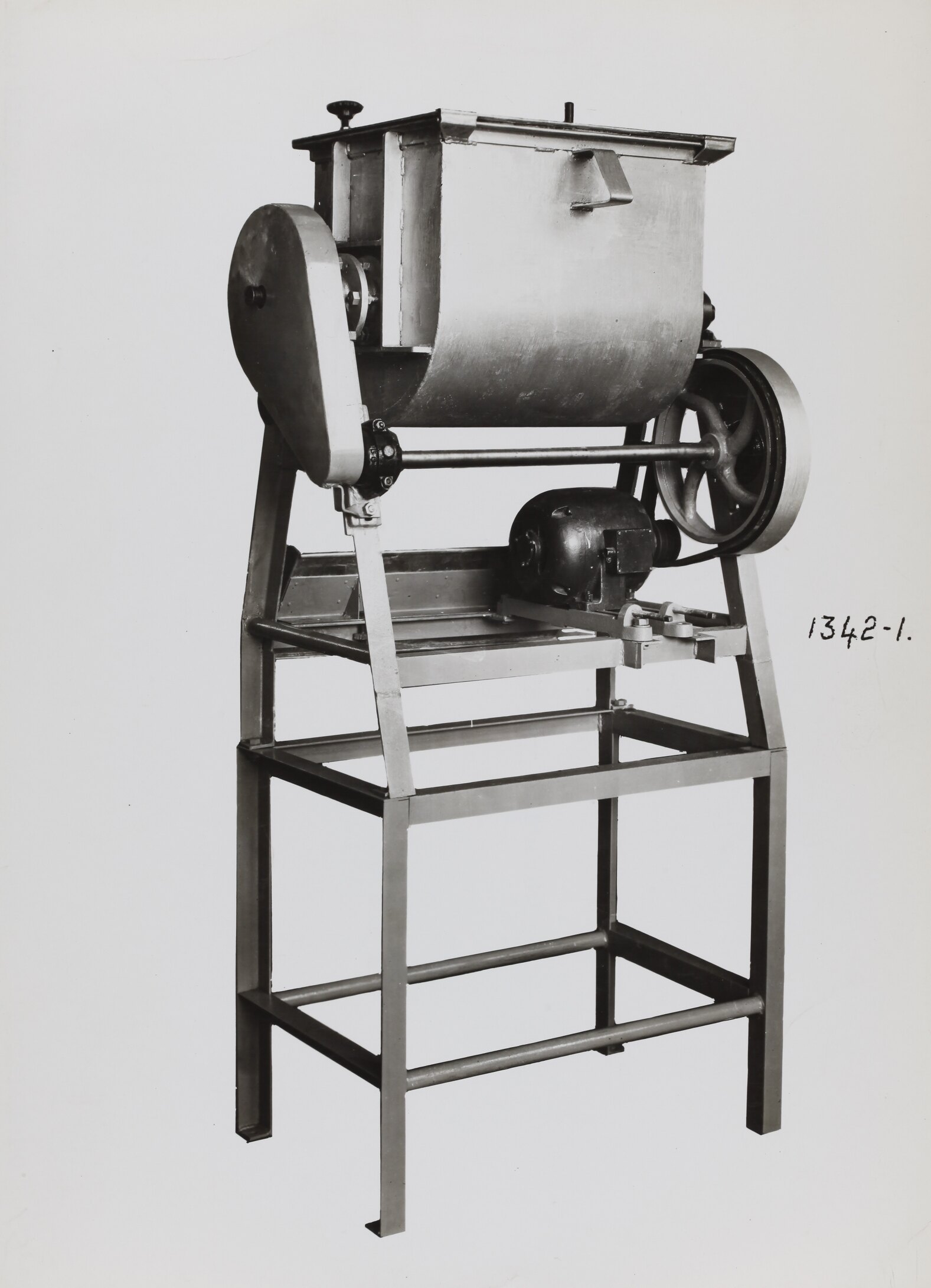 Hand written in black ink on front of photograph: '1342-1.' Printed in red ink on back of photograph: 'OFFICE COPY' Printed in black ink on back of photograph: 'PHOTO FILE NO / SECTION / JELLY CRYSTAL MIXER --- SUPPLIED / TO OR. -- 1945' Hand written in grey pencil on back of photograph: '15 / No'