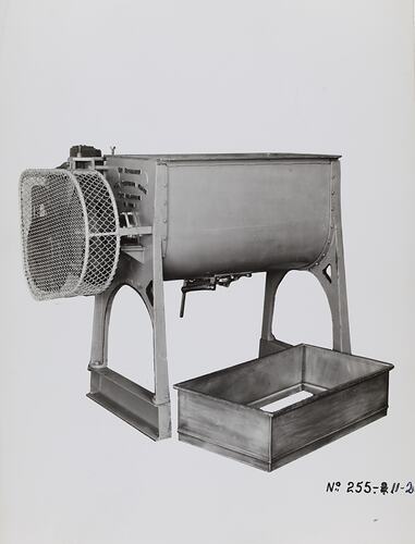 Black and white promotional image of a mixing machine. It is part of a collection of photographs and marked printer's copy used in the preparation of trade literature promoting products manufactured by the Schumacher Mill Furnishing Works Pty Ltd. The items were originally housed in a wooden filing drawer, with many filed by subject. This photograph was previously filed under 'Stainless'.