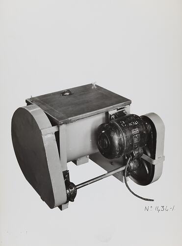 Black and white promotional image of a 20 lbs mixing machine. It is part of a collection of photographs and marked printer's copy used in the preparation of trade literature promoting products manufactured by the Schumacher Mill Furnishing Works Pty Ltd. The items were originally housed in a wooden filing drawer, with many filed by subject. This photograph was previously filed under 'Stainless'.