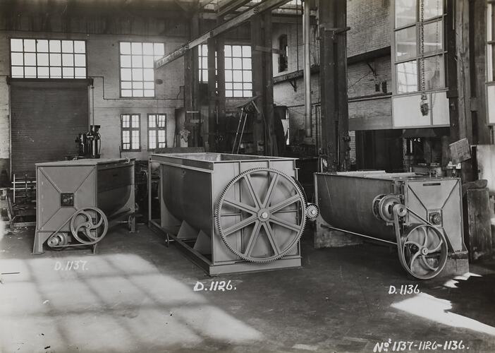 Black and white image depicting three mixing machines. It is part of a collection of photographs and marked printer's copy used in the preparation of trade literature promoting products manufactured by the Schumacher Mill Furnishing Works Pty Ltd. The items were originally housed in a wooden filing drawer, with many filed by subject. This photograph was previously filed under 'Stainless'.