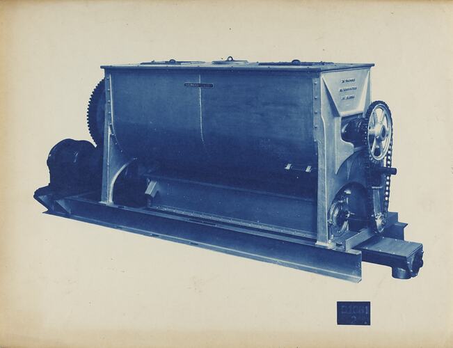 Cyanotype promotional image of a mixing machine. It is part of a collection of photographs and marked printer's copy used in the preparation of trade literature promoting products manufactured by the Schumacher Mill Furnishing Works Pty Ltd. The items were originally housed in a wooden filing drawer, with many filed by subject. This photograph was previously filed under 'With Sifter Under'.