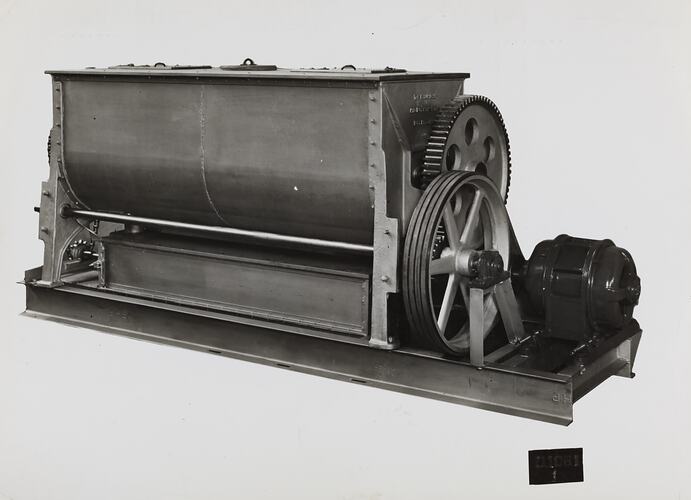 Printed in grey text on front of photograph: 'D1061 / 1' Printed in black ink on cream label attached to back of photograph: 'From / Schumacher Mill Furnishing Works / PROPRIETARY LIMITED. / PORT MELBOURNE, / VICTORIA.' Printed in black ink on back of photograph: 'PHOTO FILE NO / 30" 0 X 84" LONG MIXER AND SIFTER -- SUPPLIED TO / OR NO 3 7 3 4 1 - 30/5/38' Printed in purple ink on back of photograph: 'Kerr / BROS. / COMMERCIAL / PHOTOGRAPHERS / 533 COLLINS ST. MELBOURNE'
