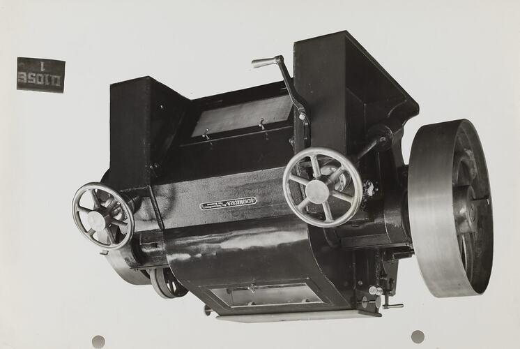 Printed in black ink on back of photograph: 'SCHUMACHER MILL FURNISHING WORKS PTY. LTD. / GRAHAM ST. PORT MELBOURNE. / S. C. 7 VICTORIA. / TELEPHONE MX 2171' Printed in red ink on back of photograph: 'ROLLER MILL' Printed in black ink on back of photograph: 'Kerr / BROS. / COMMERCIAL / PHOTOGRAPHERS / 533 COLLINS ST. MELBOURNE' Printed on the front of photograph: 'D.1056 / 1'
