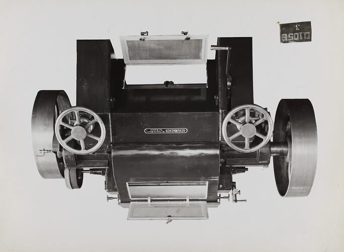 Printed in black ink on back of photograph: 'SCHUMACHER MILL FURNISHING WORKS PTY. LTD. / GRAHAM ST. PORT MELBOURNE. / S. C. 7 VICTORIA. / TELEPHONE MX 2171' Printed in red ink on back of photograph: 'ROLLER MILL' Printed in black ink on back of photograph: 'Kerr / BROS. / COMMERCIAL / PHOTOGRAPHERS / 533 COLLINS ST. MELBOURNE' Printed on the front of photograph: 'D.1056 / 3'
