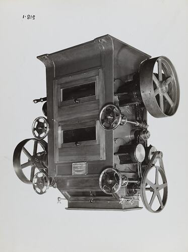 Black and white promotional image of a machine. It is part of a collection of photographs and marked printer's copy used in the preparation of trade literature promoting products manufactured by the Schumacher Mill Furnishing Works Pty Ltd. The items were originally housed in a wooden filing drawer, with many filed by subject. This photograph was previously filed under 'STANDARD'.