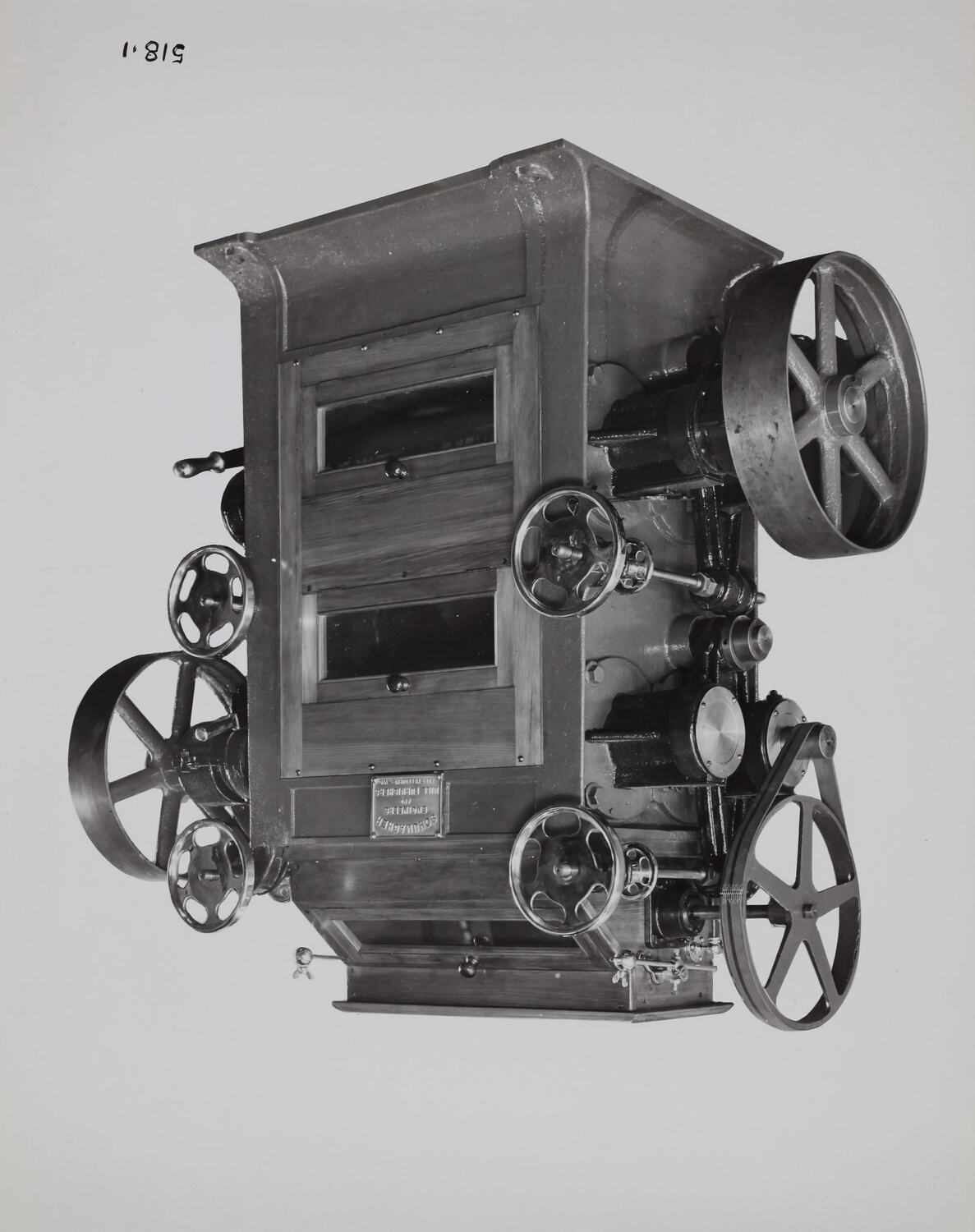 Black and white promotional image of a machine. It is part of a collection of photographs and marked printer's copy used in the preparation of trade literature promoting products manufactured by the Schumacher Mill Furnishing Works Pty Ltd. The items were originally housed in a wooden filing drawer, with many filed by subject. This photograph was previously filed under 'STANDARD'.