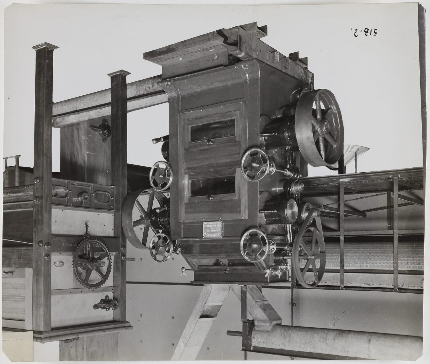 Printed in black ink on cream label attached to back of photograph: 'From / Schumacher Mill Furnishing Works / PROPRIETARY LIMITED. / Supplied under Works O.N. / 39897 - 15/7/40. (Casein Plant). / PORT MELBOURNE, / VICTORIA.' Printed in purple ink on back of photograph: 'Kerr / BROS. / COMMERCIAL / PHOTOGRAPHERS / 533 COLLINS ST. MELBOURNE' Printed in red ink on cream label attached to back of photograph: '9" x 24" 2-high DOUBLE RED. ROLLER / MILL --' Printed in black on the front of photograph: '518.2.'